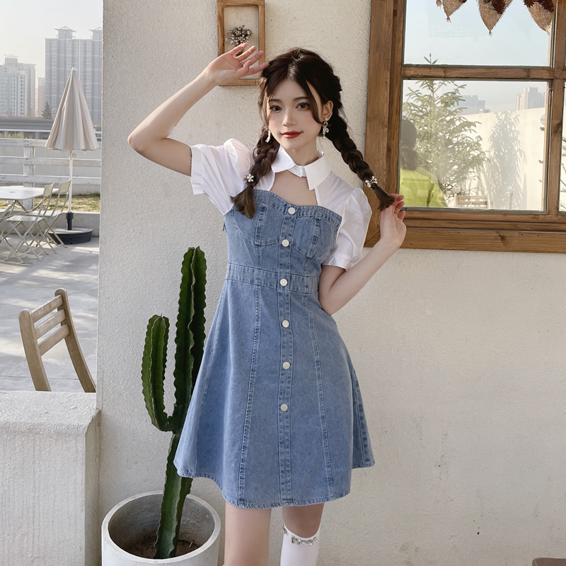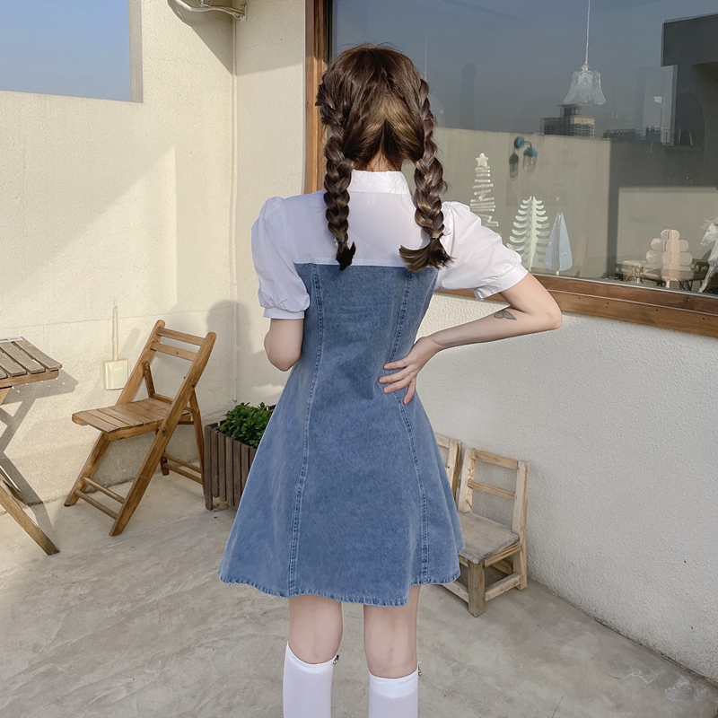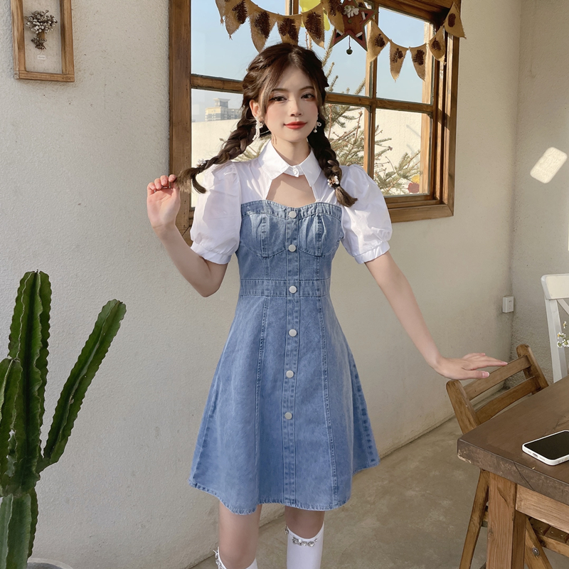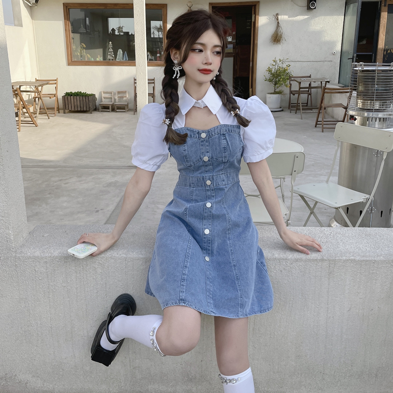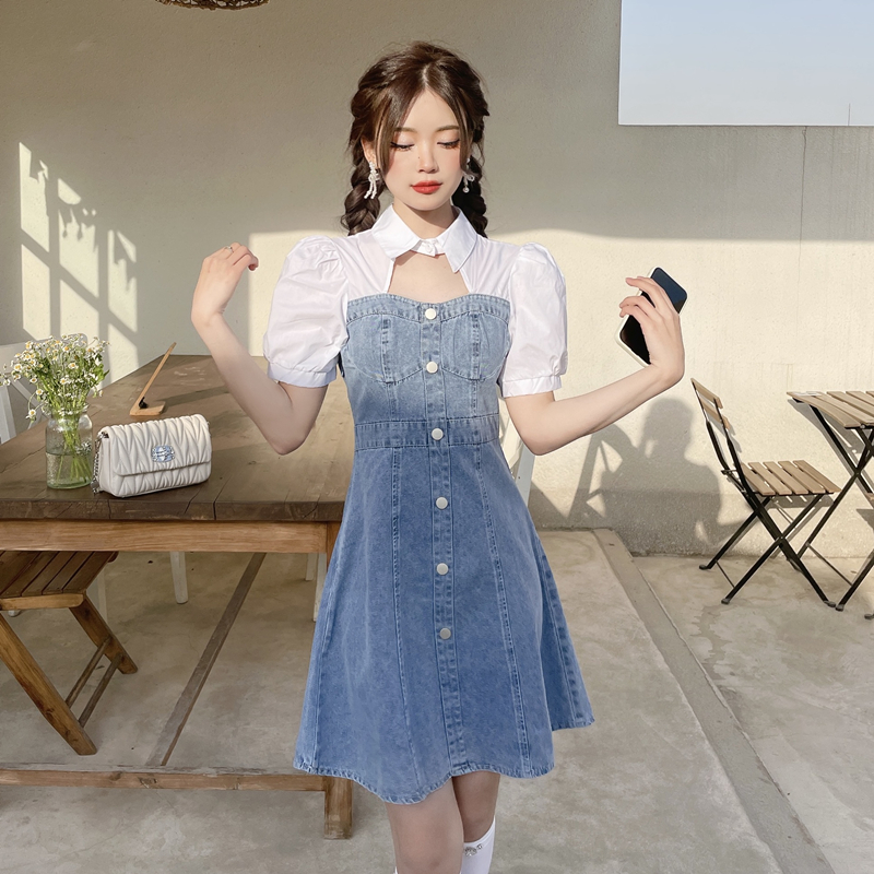 拼接牛仔连衣裙女装夏季设计感小个子甜辣风短裙气质收腰时髦裙子