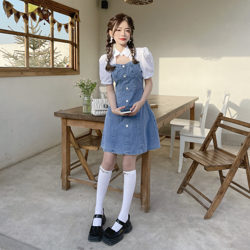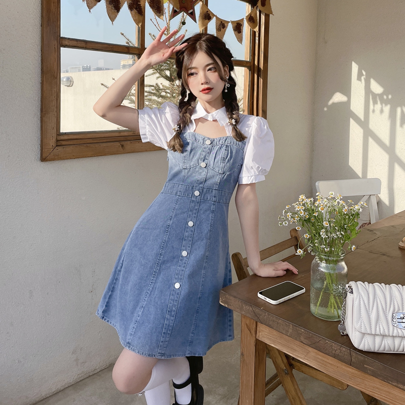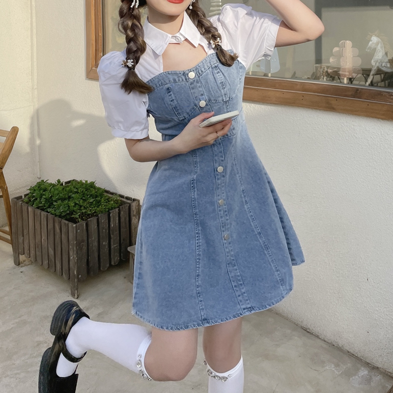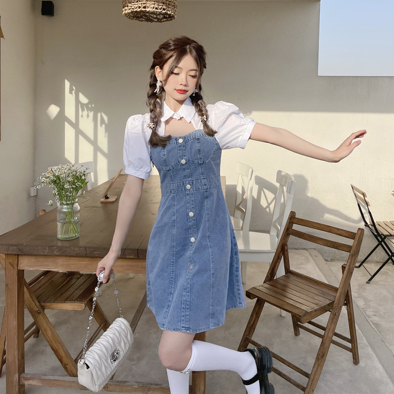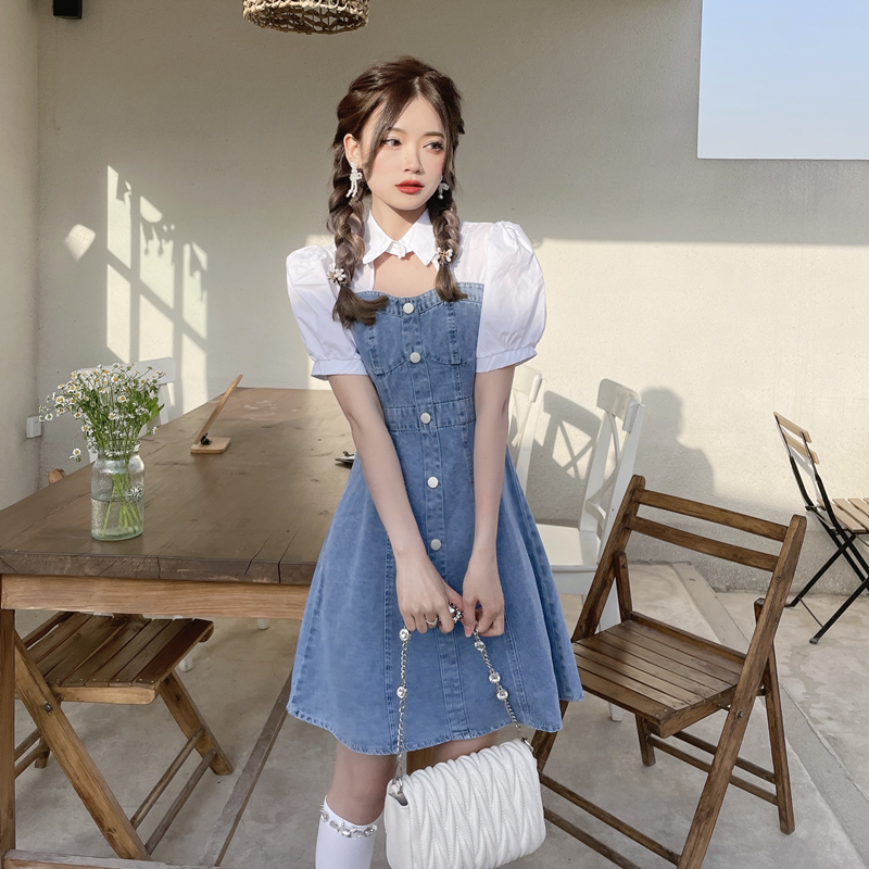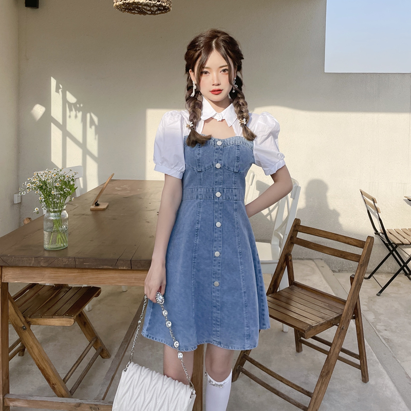 拼接牛仔连衣裙女装夏季设计感小个子甜辣风短裙气质收腰时髦裙子